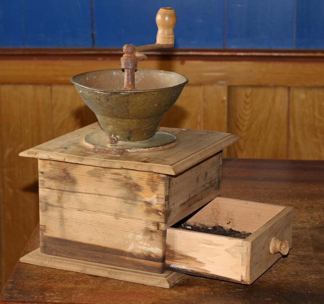 Kaffikvörn með venjulegu lagi. Kassinn er úr brenni að ofan og framan, en hliðar, bak og botn úr furu, og er hann geirnegldur. Hann er 18,6-19 cm langur og álíka breiður og um 15,8 cm hár.