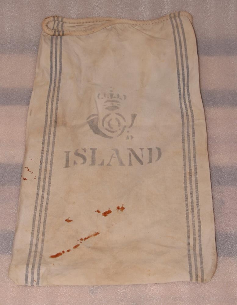 Póstpoki úr boldangi (segl). Hvítur, með þremur bláum röndum á hvorri hlið eftir endilöngu. Á framhlið pokans er prentað POSTUR, póstmerkið og ISLAND. Vel með farinn fyrir utan nokkra ryðbletti.