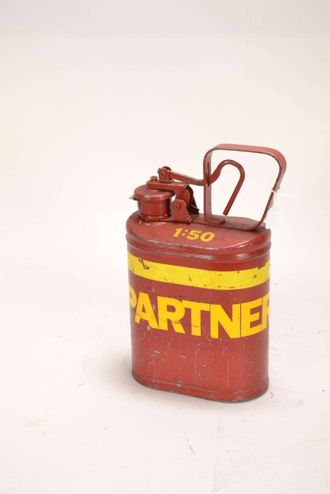 Rauður sporöskjulagaður bensínbrúsi með lokubúnaði og handfang á tappa. Á honum er gul rönd þar sem hann er merktur „Partner, 1:50“