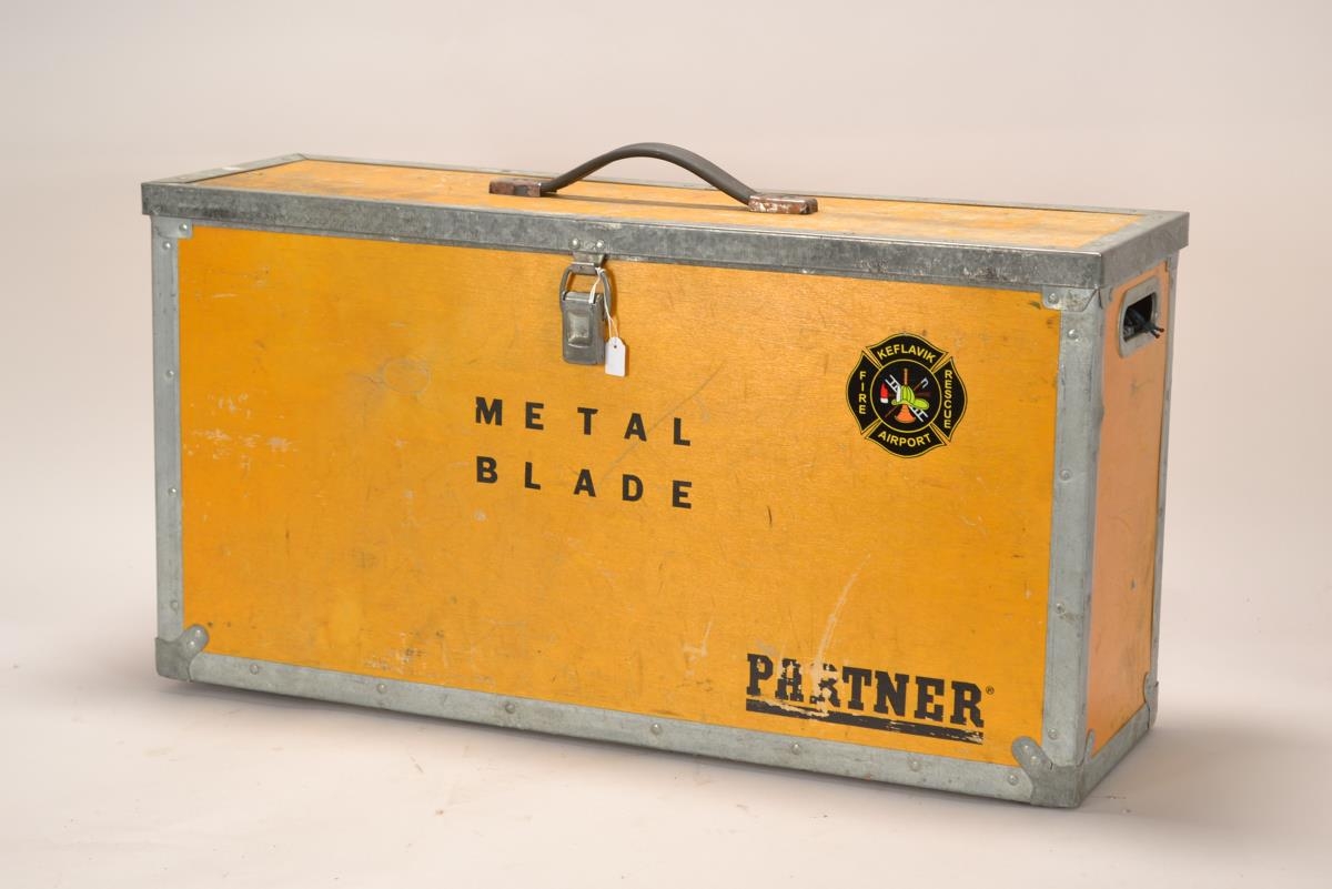 Kassi utan um "Partner" hjólsög og fylgihluti. Kassinn er úr krossvið og járnbentur á hornum. Hann er merktur „Partner, metal blade“ og einnig með merki Slökkviliðsins á Keflavíkurflugvelli.