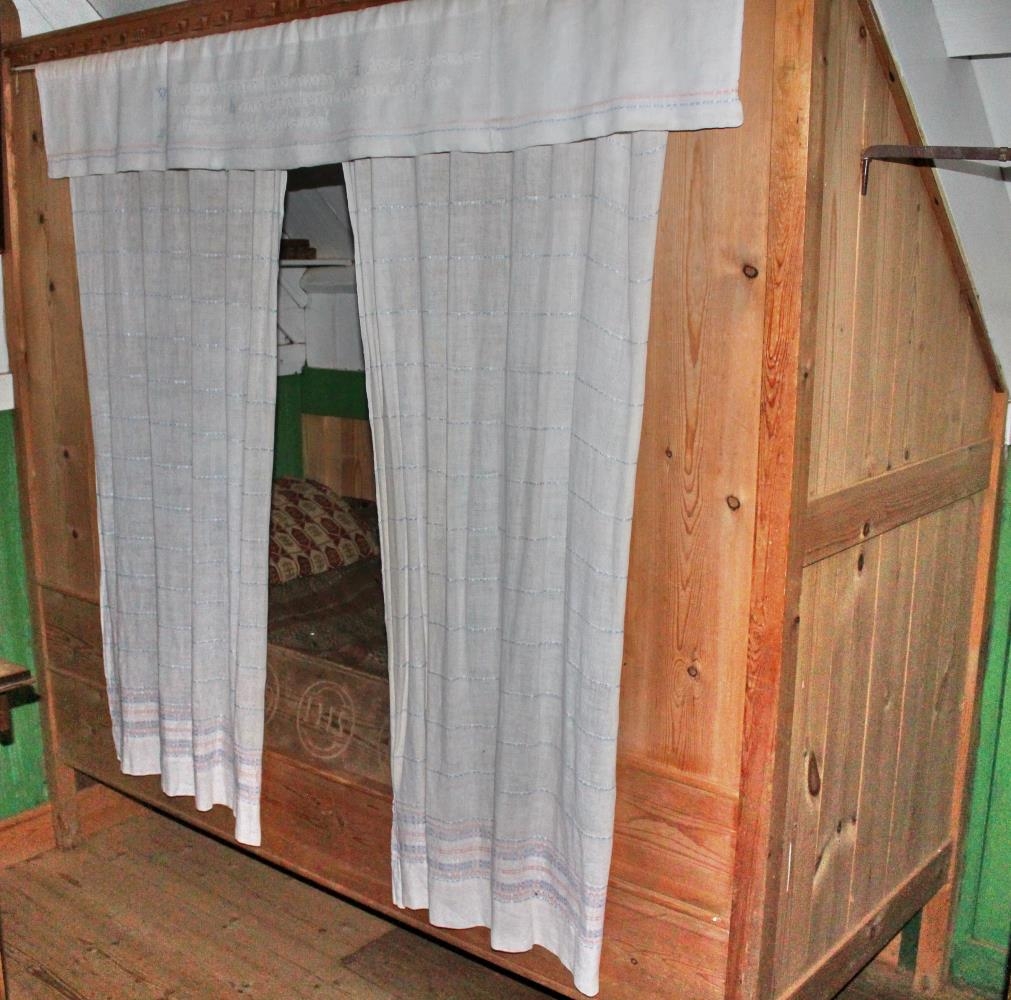 Rúmtjöld, sparlök, ofin úr hör. Yfirtjaldið er um 23 x 158 cm og í það neðarlega ofnir tveir mjóir teinar, rauðhvítur og bláhvítur og yfir þeim versið: