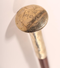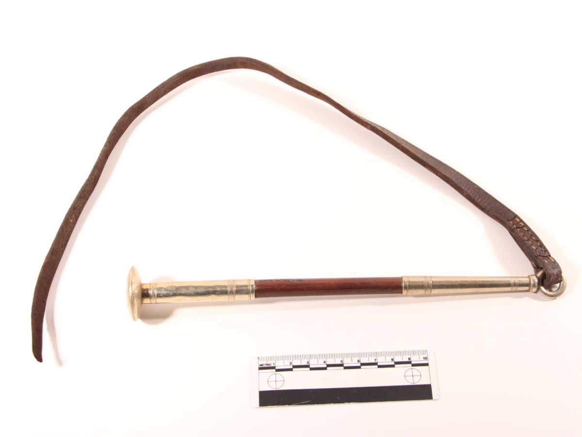 Reiðsvipa kvenmanns. Haldlengd 26,5 cm, lengd alls með ól 82 cm. Stafurinn er úr brenni, silfurbrúnn til beggja enda, fremst er 10,6 cm fínlega skreyttur partur með lykkju en hnúðmegin er parturinn 7,5 cm. Á hnúðnum stendur Jóhanna.