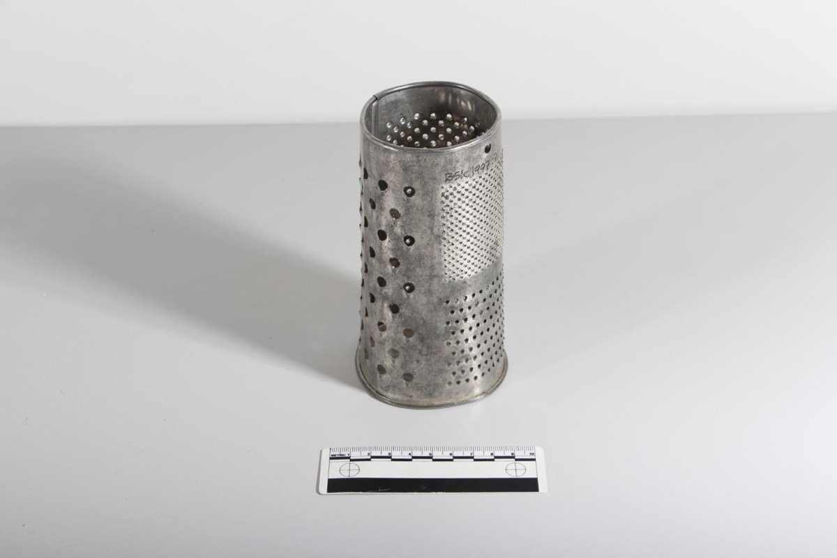 Rifjárn, grænmetisrifjárn, hringlótt úr blikki. Lengd 15 cm, þvm. 6,5 - 8,5 cm. Misgróft.