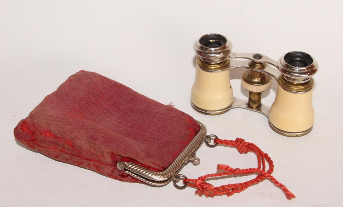 Leikhúskíkir úr blikki með nýsilfurhúð, messing og ljósdrapplituðu plasti. Í góðu lagi. Stærð 5,5, x 9,5 cm. Á miðstikkinu er takkaður plasthringur sem skrúfaður er til að stilla kíkinn. Askja eða posi fylgir kíkinum. Úr rauðu taui, stærð 8,5 x 11,5 cm. Lasinn er úr pjátri og rauð bandsnúra er á.