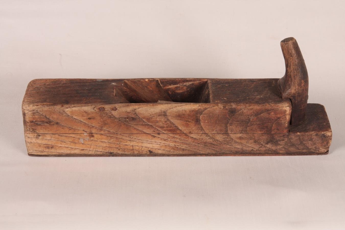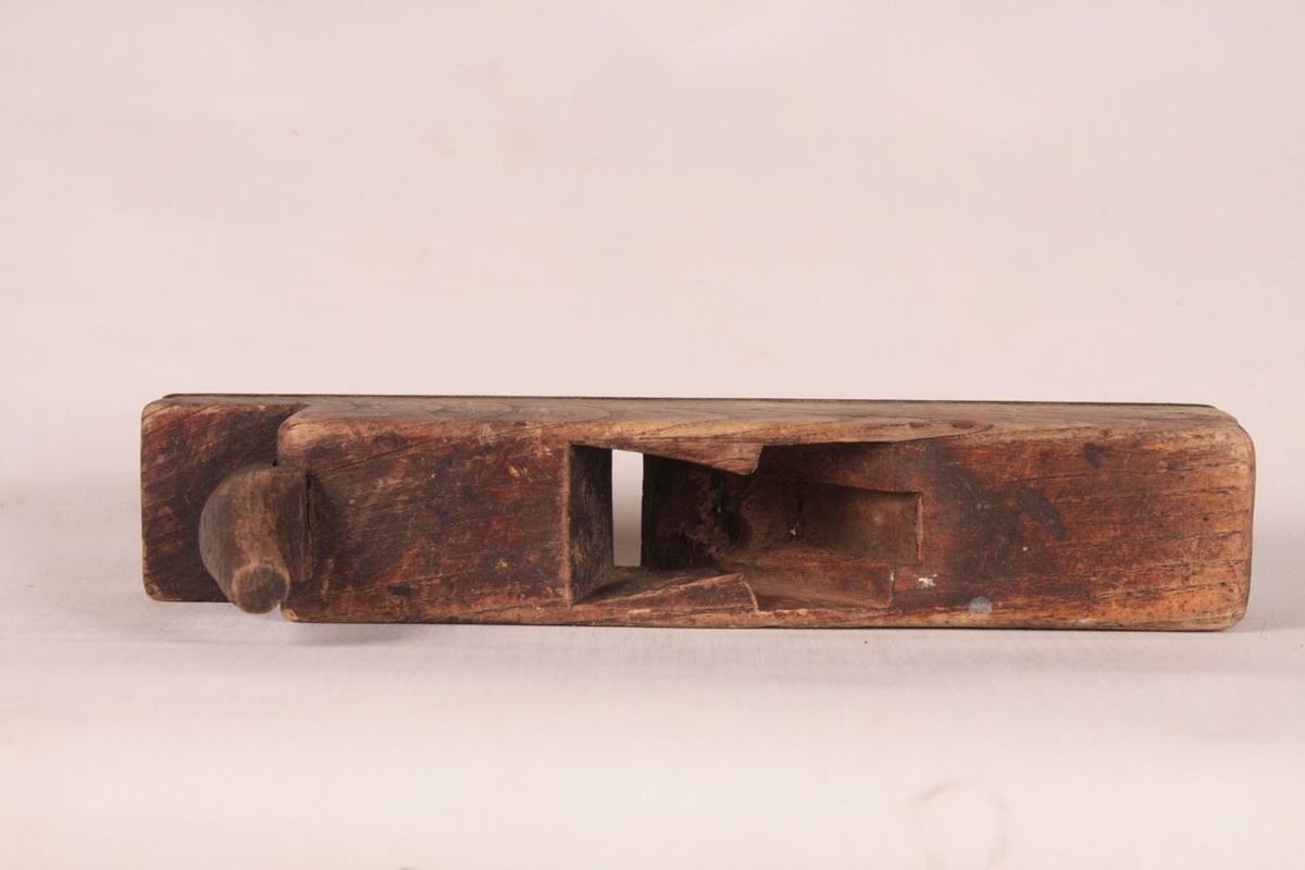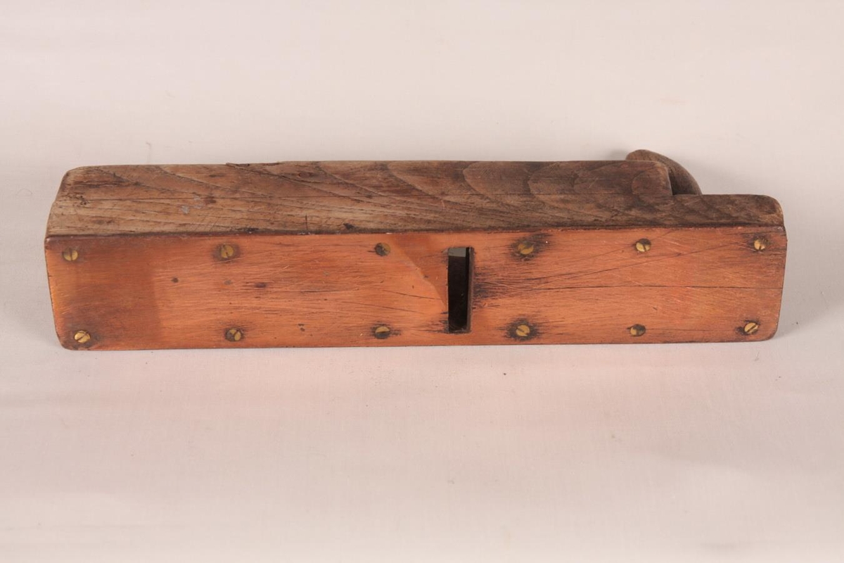 Hefill/kolluhefill úr eik. 5 x 5,5 x 27,5 cm. Hefiltönnina vantar. Handfangið er neglt á með nýlegum nagla. Allur slitflöturinn er klæddur með látúnsplötu sem skrúfuð er á með skrúfnöglum.