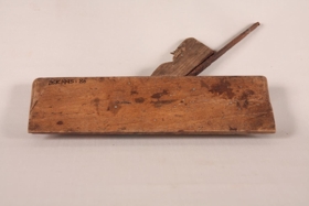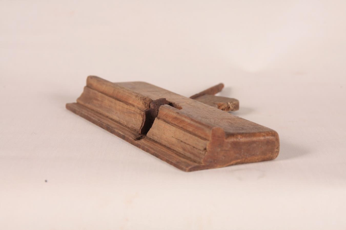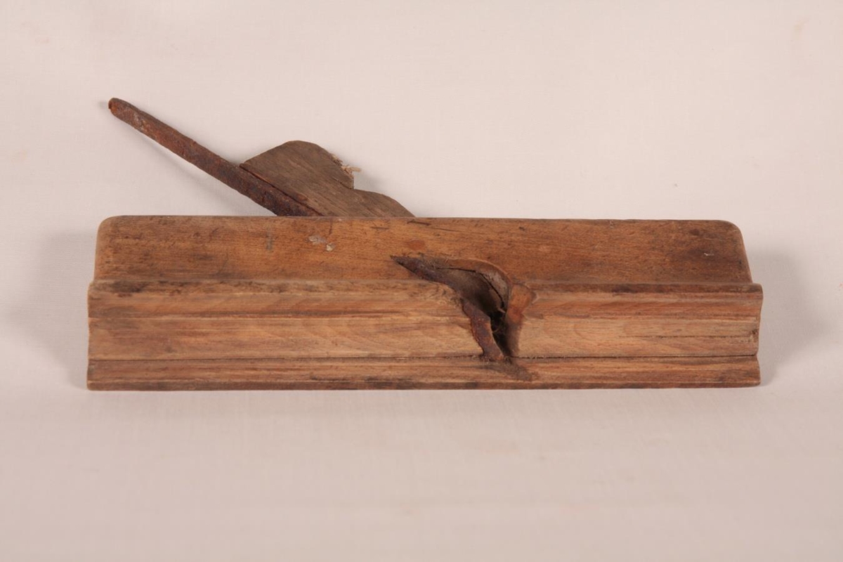 Strikhefill úr eik, 21 x 6,5 x 2,5 cm. Með járninu er smeygt fleyg úr furu (kanafjöl).
