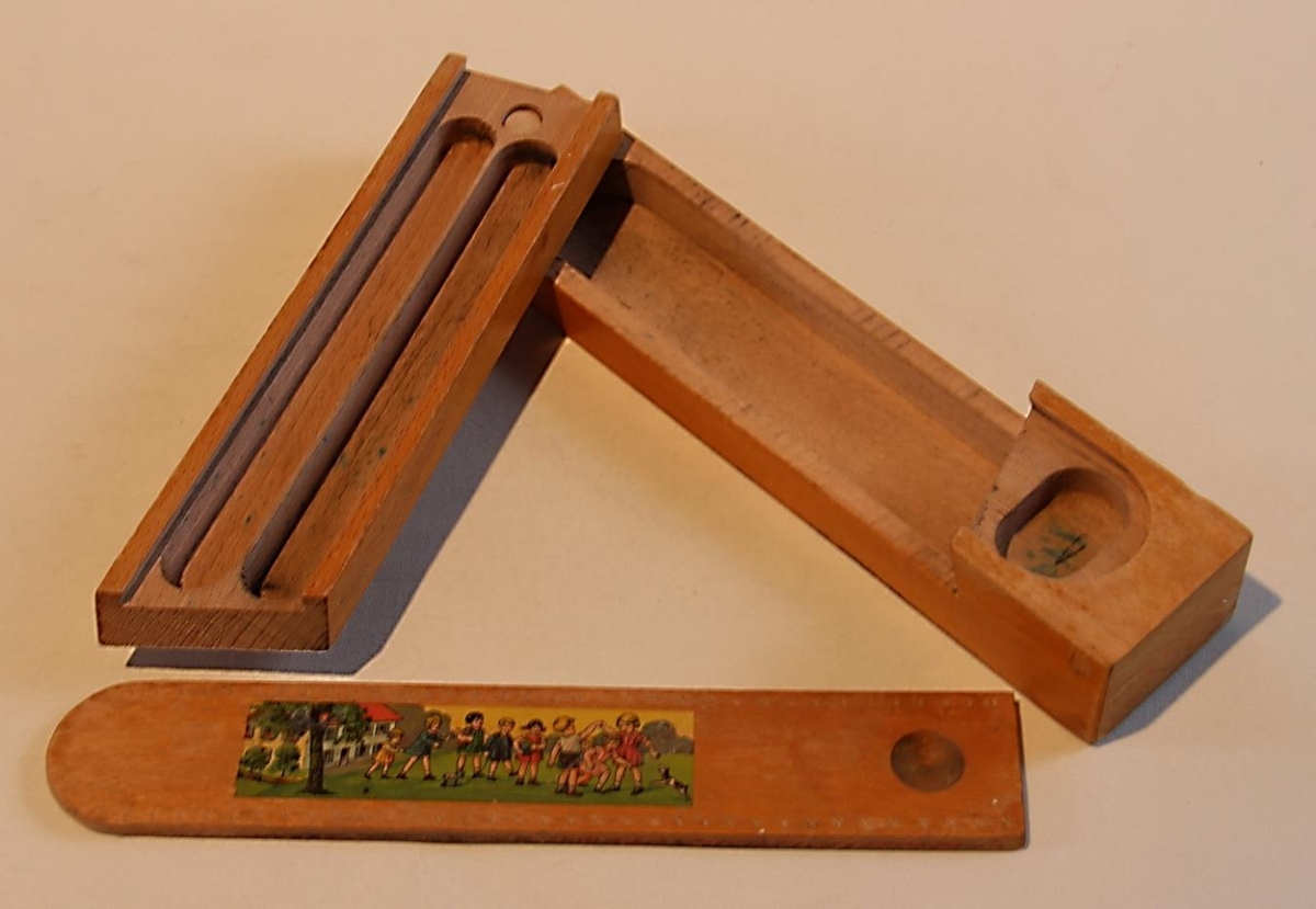 Pennastokkur úr eik. Fjögurra hólfa, lengd 23,3 cm, breidd 5 cm, hæð 3,3 cm. Tvöfaldur með lausum sleða sem læsir honum saman. Neðsta „skúffan“ er í einu lagi, efri skúffan, sem leikur á snúningssteini og gengur á ská að fótum, endar með formi (sporöskjulaga hólfi) fyrir strokleður, er tvöföld aflöng. Notaður undir sleðapenna, blýanta, liti og strokleður. Álímd mynd af skólabörnum að leik er á loki. Mjög algengt um 1950-1970. Úr dánarbúi Ingólfs Nikódemussonar á Sauðárkróki.