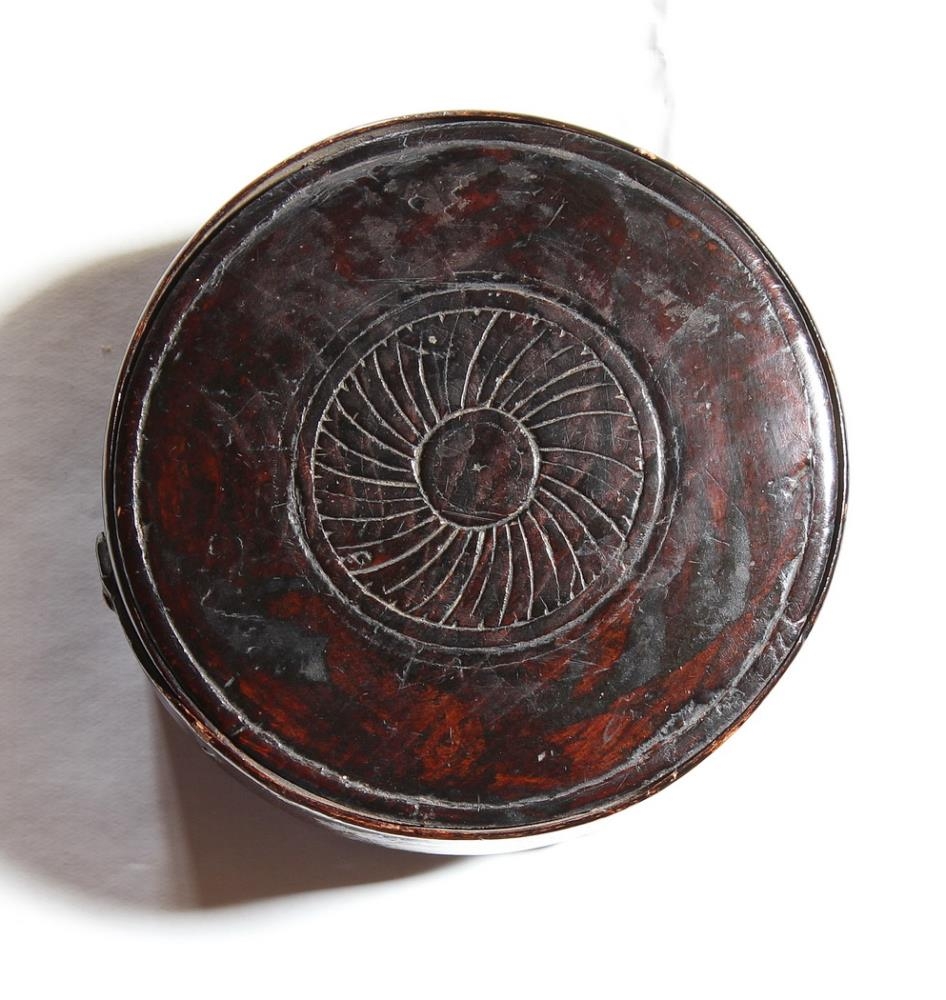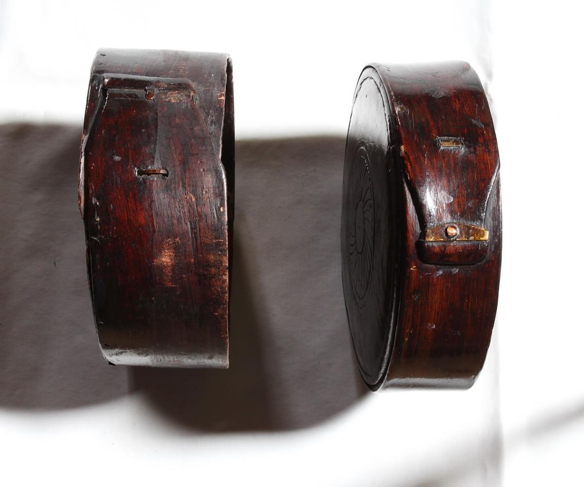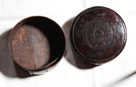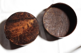 Askja úr furu og girði, er lökkuð dökkbrún. Kringlótt. Girðirinn er festur með koparfestingum og eirtöppum. Botn og lok eru trénegld. Á lokinu eru útskornir hringir, hver innan í öðrum. Notað undir smáhluti.