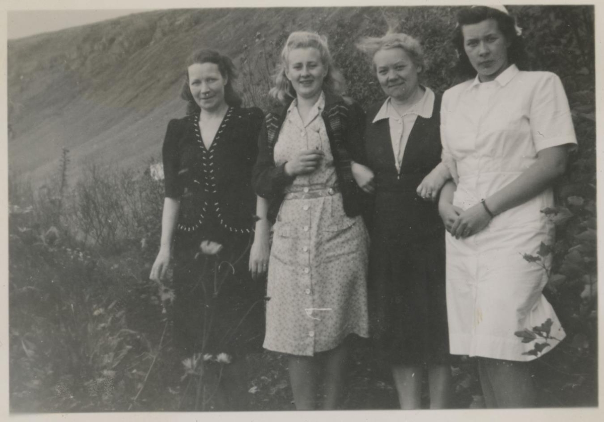 Bjarnfríður Einarsdóttir handavinnukennari, Anna Björnsdóttir vefnaðarkennari, Kristjana Hannesdóttir skólastjóri og Unnur Árnadóttir matreiðslukennari. Húsmæðraskólinn á Staðarfelli 1946-1947.