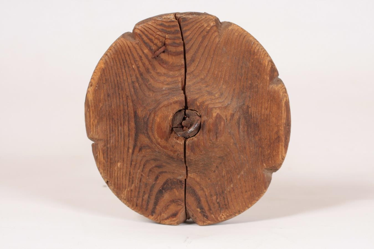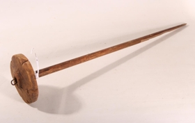 Snælda (f. hrosshár) úr furu. Þykkt 2,5 - 2,8 cm. Lengd 56 cm og þv. 12 cm. Járnkrókur er ofan á snældunni sem gengur í gegn um smiðinn. Á smið eru sex raufar. Endi snældunnar er brotinn.