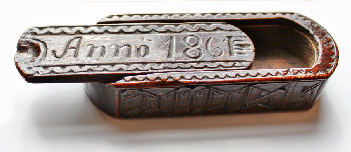 Stokkur úr furu, lakkaður dökkbrúnn. Stokkurinn er bogadreginn á endum. Stærð: 13,6 x 5 x 3 cm. Lokið á stokknum er dregið út með vinstri hendi og er 12,5 x 3,8 x 0,5 cm. Dýptin er 2,1 cm. Stokkurinn er fallega útskorin með höfðaletri á hliðunum, þar stendur IONAS (Jónas) PETURS (Pétursson). Á lokinu stendur Anno 1861.