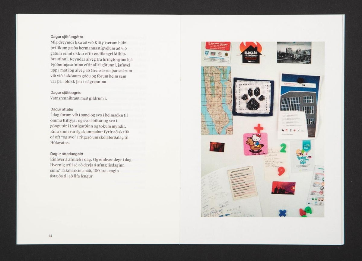Bókin er 32 tölusettar blaðsíður, heftuð með mjúkum ljósbláum spjöldum. Texti á íslensku og litljósmyndir. Letur: Suisse Works og Suisse Int'l. Pappír: Munken Pure Rough 100 gr. Colorit 120 gr. Prentun Ásprent, Akureyri.