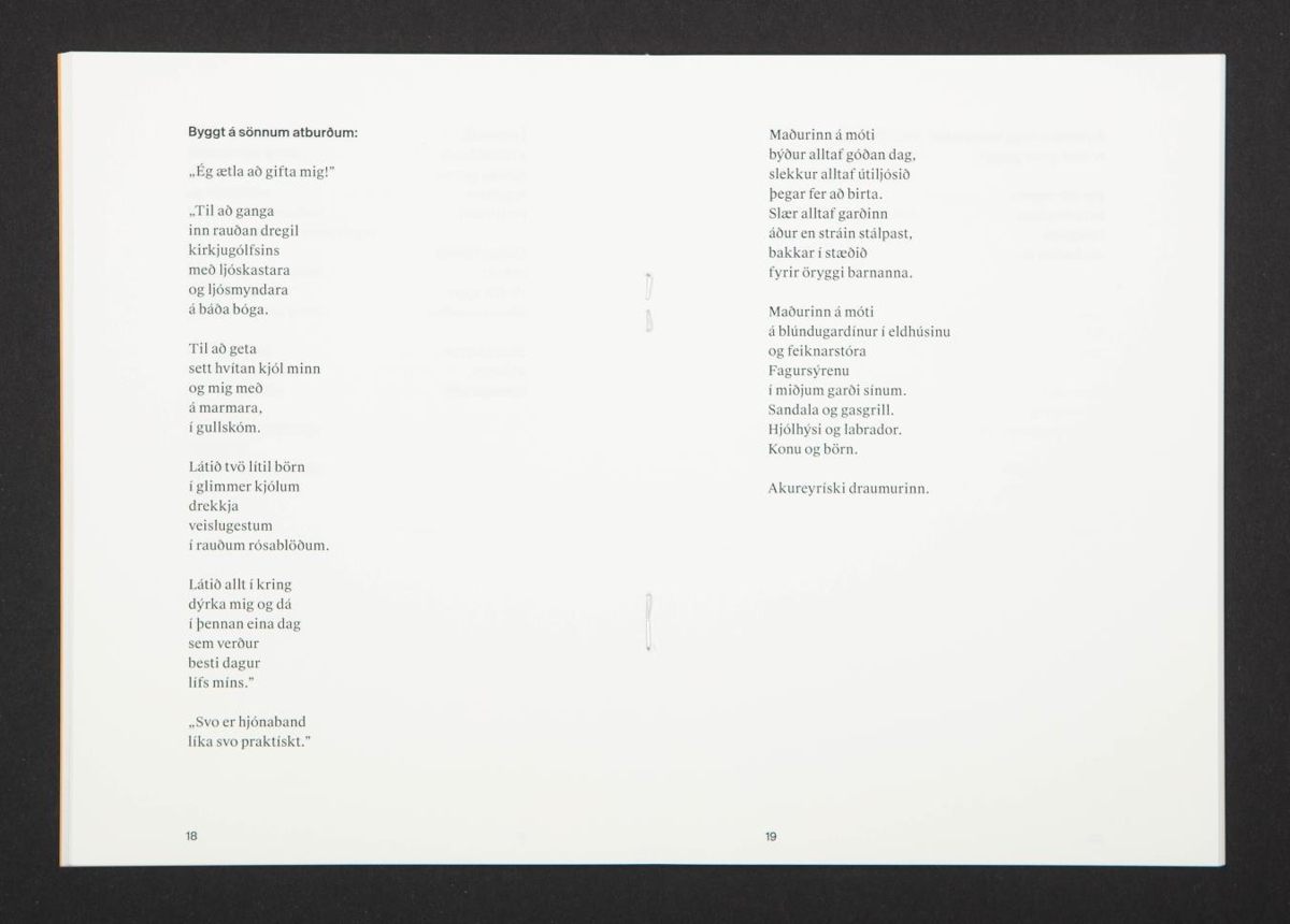Bókin er 36 tölusettar blaðsíður, heftuð með mjúkum appelsínugulum spjöldum. Texti á íslensku. Letur: Suisse Works og Suisse Int'l. Pappír: Munken Pure Rough 100 gr. Colorit 120 gr. Prentun Ásprent, Akureyri.