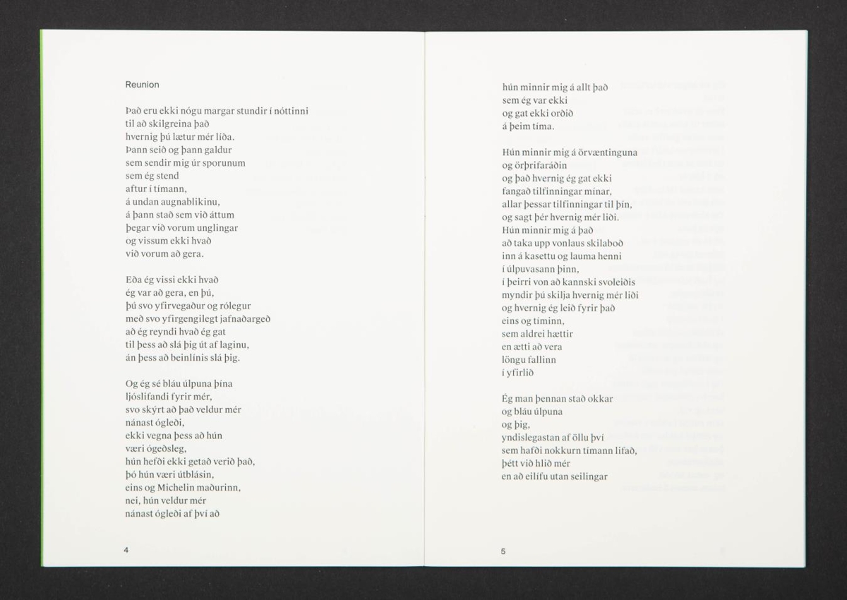 Bókin er 28 tölusettar blaðsíður, heftuð með mjúkum grænum spjöldum. Texti á íslensku. Letur: Suisse Works og Suisse Int'l. Pappír: Munken Pure Rough 100 gr. Colorit 120 gr. Prentun Ásprent, Akureyri.