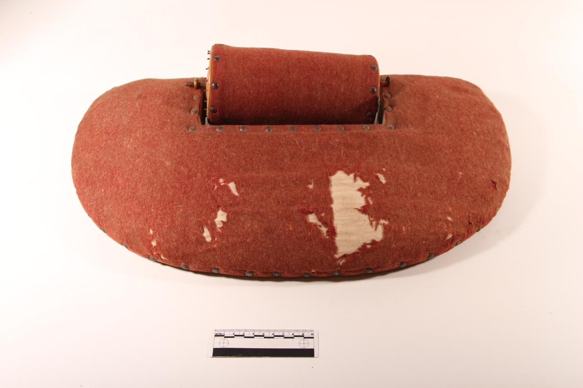 Knipplingaborð úr furu, 32 x 55 cm. Öðru megin er það ávalt en hinu megin er í því skarð fyrir rúlluna, 12 x 22,7 cm. Borðið er klætt rauðu flókaefni, og er undir því hvítt léreft og hálmstopp, fest með járnbólum umhverfis. Undir borðinu eru tveir listar er þynnast til annars enda og hallast því borðið er það stendur.