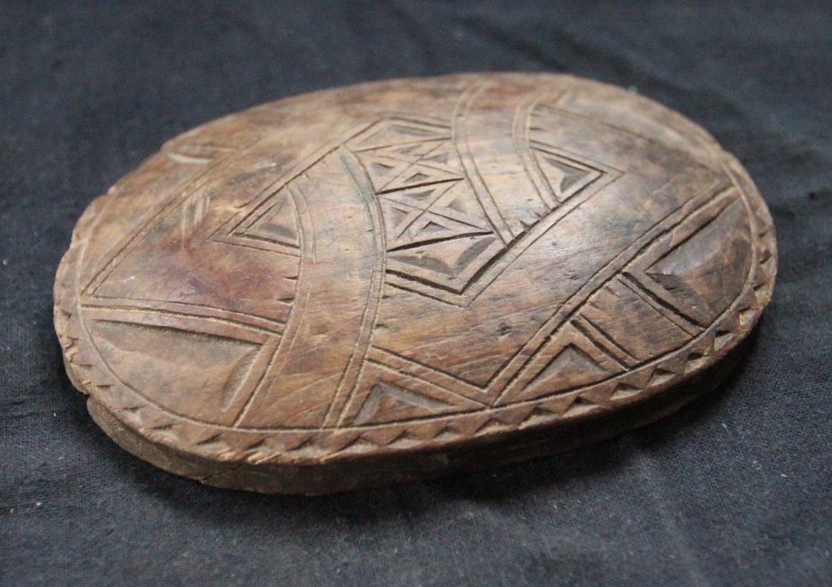 Smjöröskjulok/öskjulok úr furu. Gamalt, útskorið, sporöskjulaga. Stærð 11,3 x 7,7 cm, þykkt um 1 cm. Svolítið kúpt. Allur kantur skorinn, sem og efri hlið. Á henni er tígull sem er „bundinn“ niður til endanna með „borða“.