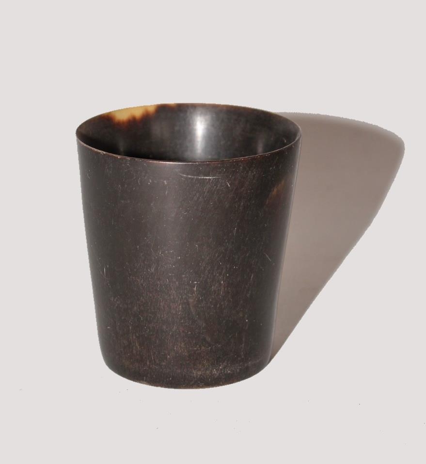 Snafsastaup úr kýrhorni með renndri hornplötu í botninn. Mjög glæsilegt. Örlítið flekkótt, annars mjög dökkt á litinn.