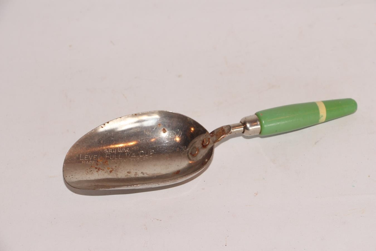 Sykurskeið úr járni. Með grænmáluðu tréhaldi sem á er gulleit rönd. Lengd 19,3 cm. Í skófluna/ausuna er grafið: Skyline LEVEL FULL 1/4 + MADE IN BURNLEY, ENGLAND.