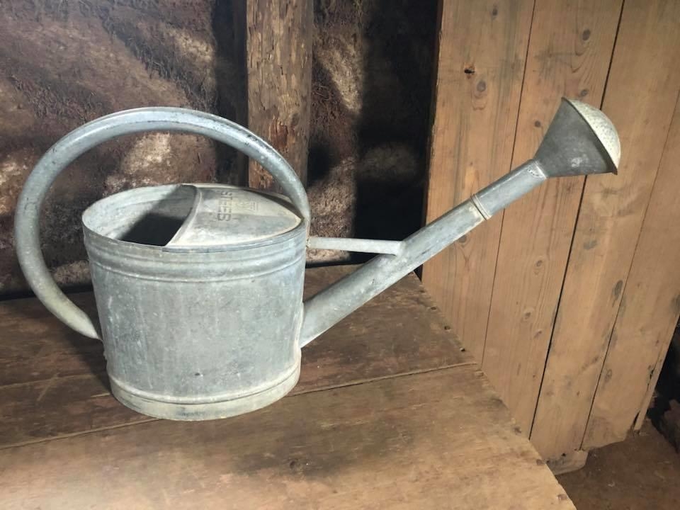 Garðkanna úr járni. Kannan tekur 8L. Hæð á hald 38 cm. Vídd 16,5 cm. Lengd á stút 46 cm. Á lokinu stendur STEEB. Haldið er í boga. Hausinn á stútnum er hægt að taka af.