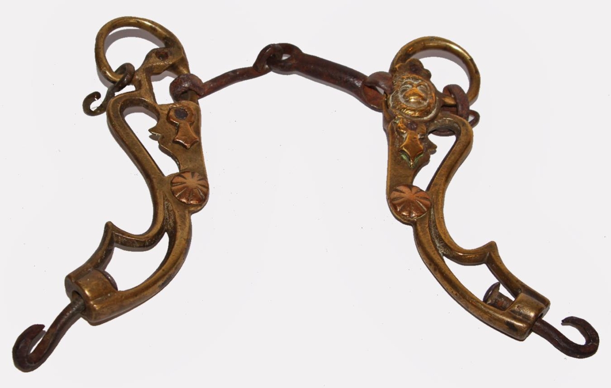 Stangamél úr kopar, steyptar. Með misbreiðum bitlingum (mélum). Stangalengd með járnlykkju er 19,5 cm. Skjöldur með ljónshaus er yfir méllykkju vinstra megin en hefur dottið af hægra megin.