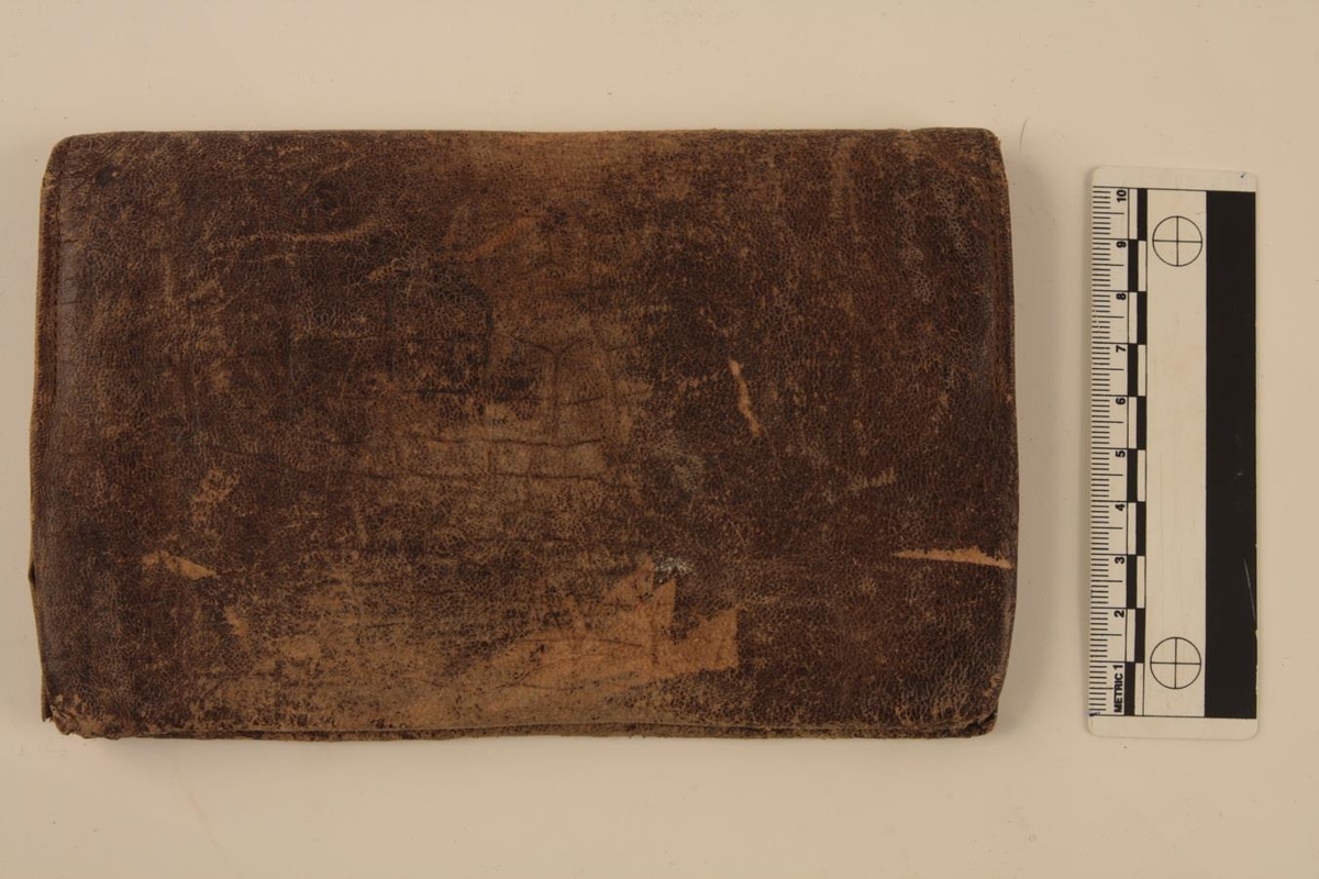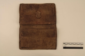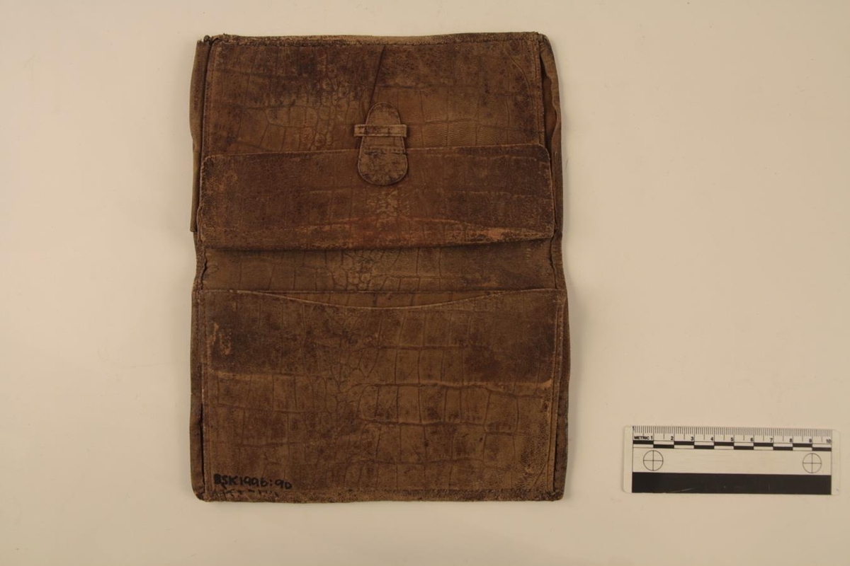 Seðlaveski úr brúnu leðri, fóðrað með brúnu taui, með fjórum hólfum. Stærð 18 x 11 cm. Opið 22,7 x 18 cm.