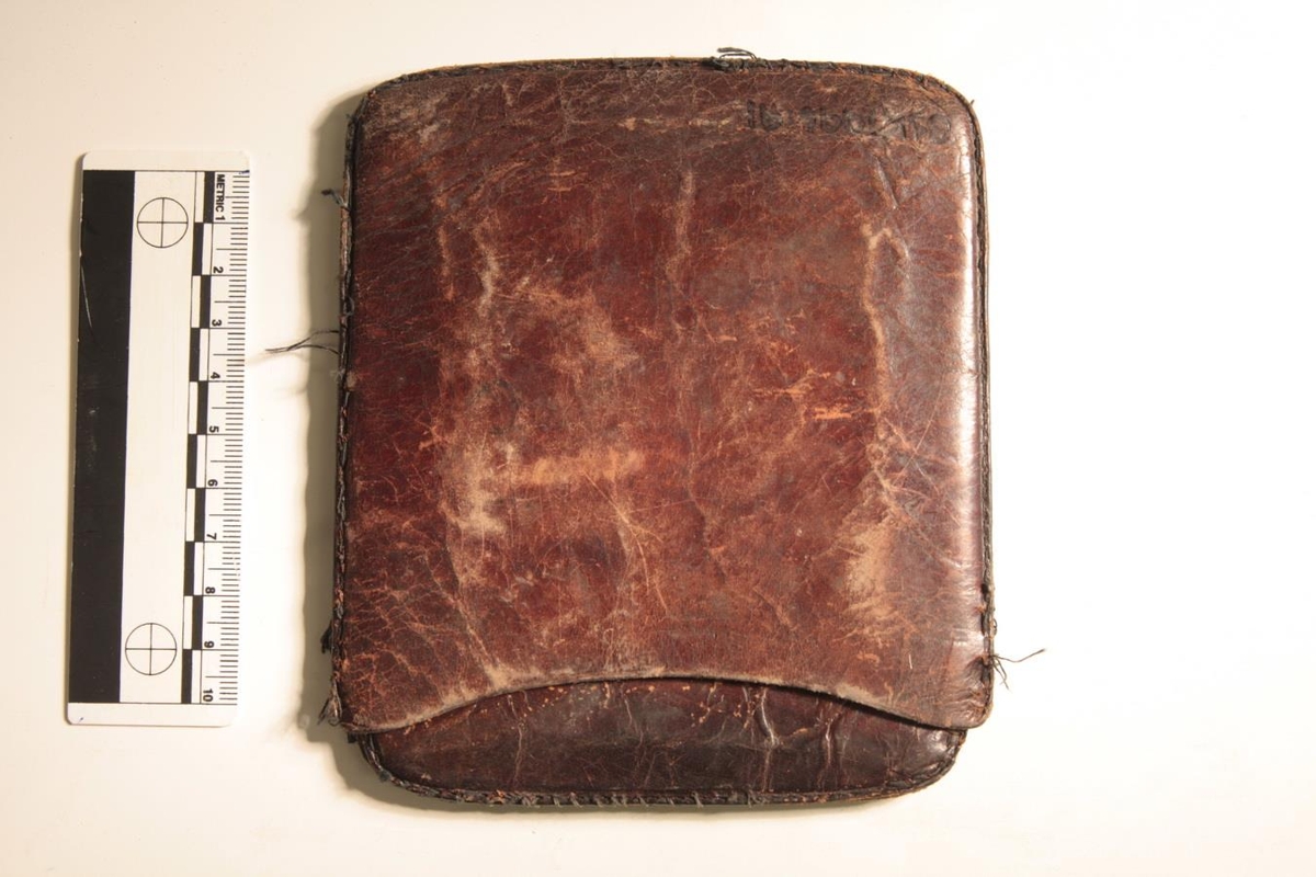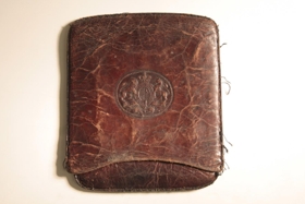 Seðlaveski, myntveski úr dökku leðri. Tvöfalt og er öðrum helmingnum smeygt inn í hinn. Í góðu standi. Á aðra hliðina er þrykkt skjaldarmerki bresku krúnunnar, ljón og einhyrningur eru skjaldberar og kóróna efst.