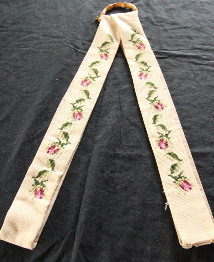 Bakkabönd úr bómull, hvítur jafi með krosssaumuðum grænum og fjólubláum blómum. Fóðrað með hvítu lérefti. Breidd er 4,6 og lengd er 89 cm. Upphengið er skeifulaga bambus með messingprjóni. Breidd prjóns er 8,9 cm.