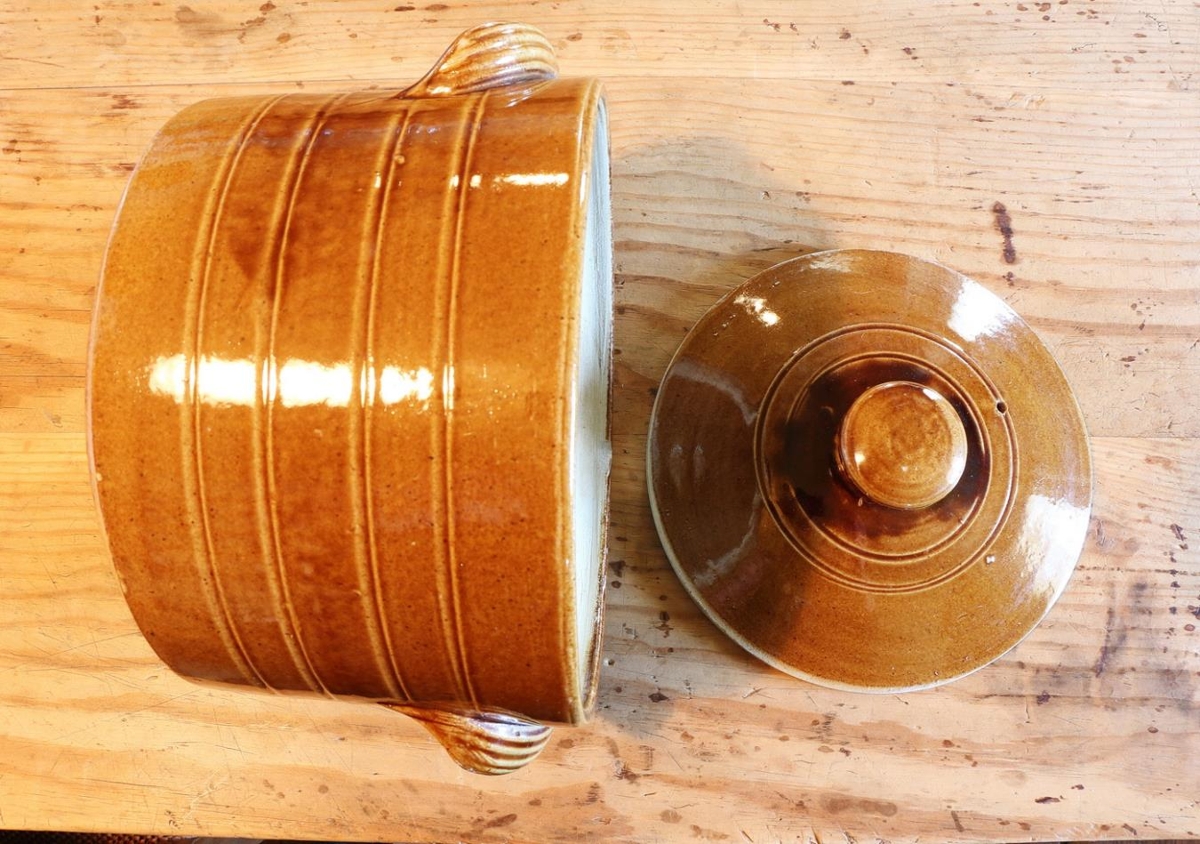 Leirpottur (dúspottur), brún glerjaður að utan, en ljósdrappaður að innan. Með eyrum, renndur. Lokað með þykkum hnúð. Notaður undir súrmat og annan mat. Hæð potts er 11,8 cm, þvermál hans á barma er 20 cm, botn 19 cm. Merktur á hlið "2qt" (2kvikt). Gat á loki (þrýstings- eða gufugat). Potturinn er sprunginn en ólekur.