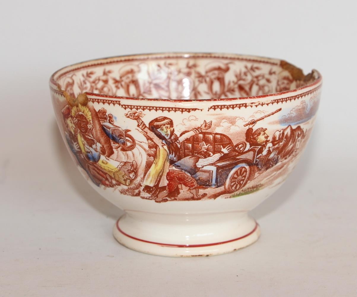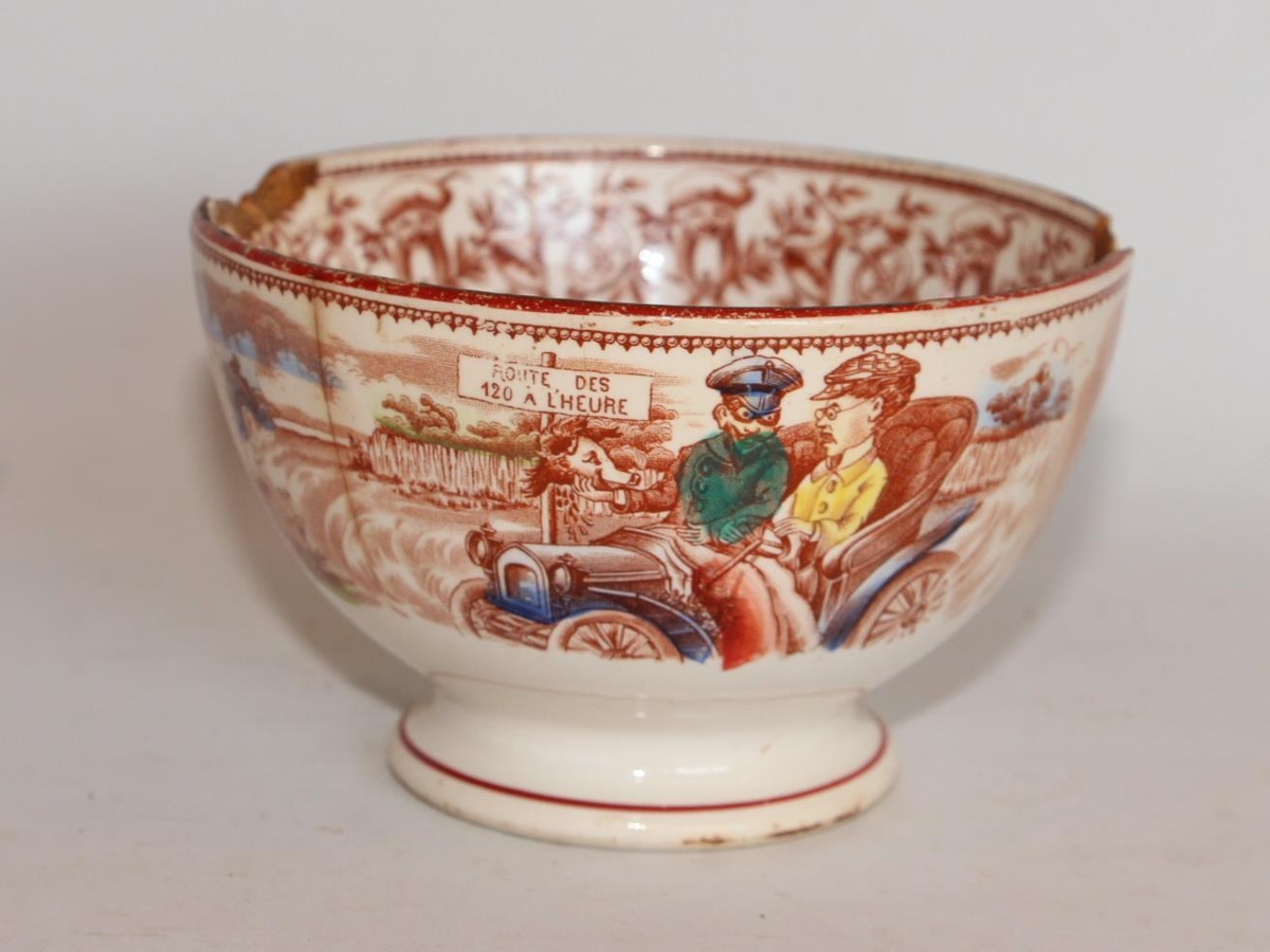 Á skálinni er mynstur allt um kring í brúnum, rauðum, bláum, gulum og grænum lit. Innan á börmum er brúnt mynstur með stýrishjóli, flautu, aktygjum og derhúfu. Mynstrið utan á sýnir meira og minna bílstjóra og farþegar þeirra.