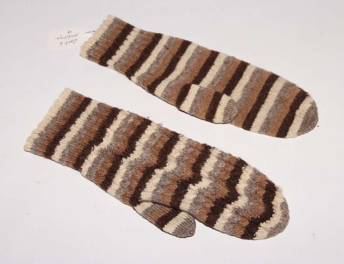 Vettlingar - kvenvettlingar úr bómull mislitir, röndóttir: Hvítt, grátt, ljósmórautt og dökkmórautt. Úr eingirni, þeli. Lengd 24,4 cm. Mest breidd er 8,5 cm. Stroffið er prjónað með 2 x 2 lykkjum, sléttum og brugðnum á víxl, 68 lykkjur alls á mjög fína prjóna. Lófi og þumall er allur úr sléttu prjóni. Bak er prjónað með kaðlaprjóni, tveir leggir sitt hvoru megin við miðju sem er prjónað með skeljabekk.