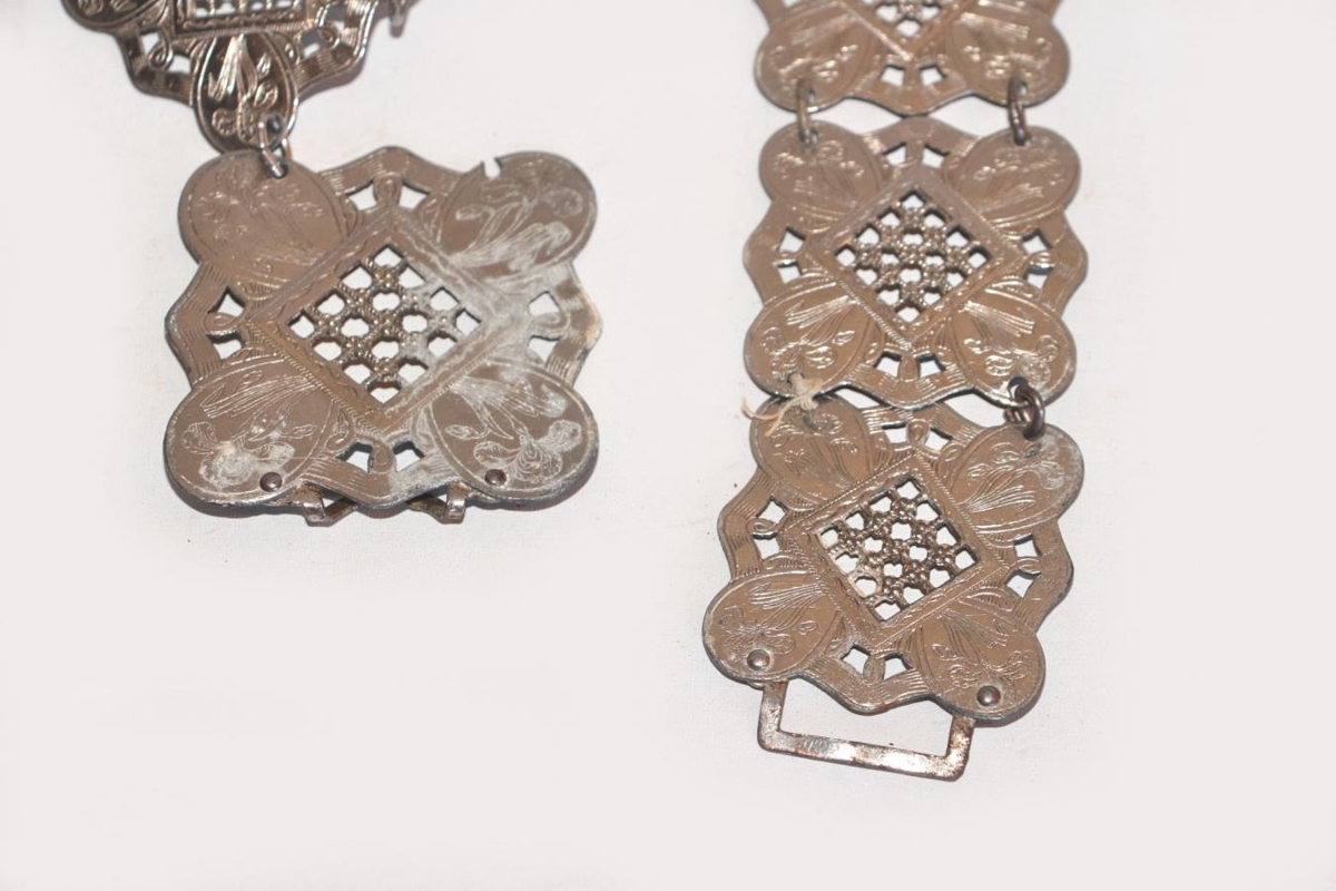 Stokkabelti úr nikkel, silfurhúðað á framhlið. Lengd alls 71 cm og breiddin er 4,2 cm á 15 stokkum; miðjustokkurinn er stærstur 5,2 x 5,2 cm. Á framhlið er liljumynstur, netmynstur í miðju, mynstur er pressað í málminn. Lykkjufestingar skrúfaðar á. Stokkarnir eru festir saman með lykkjum. Aftan á hverjum stokk er stimpill sem á stendur REG - N - 592981.