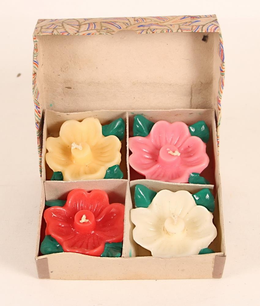 Skrautkerti, fjögur stykki úr vaxi, blómlaga, í mismunandi litum - gult, rautt, hvítt og bleikt - með grænum blöðum. Stærð u.þ.b. 7,8 cm í þvermál, mest um 10 cm á breidd og 3,8 cm á hæð.