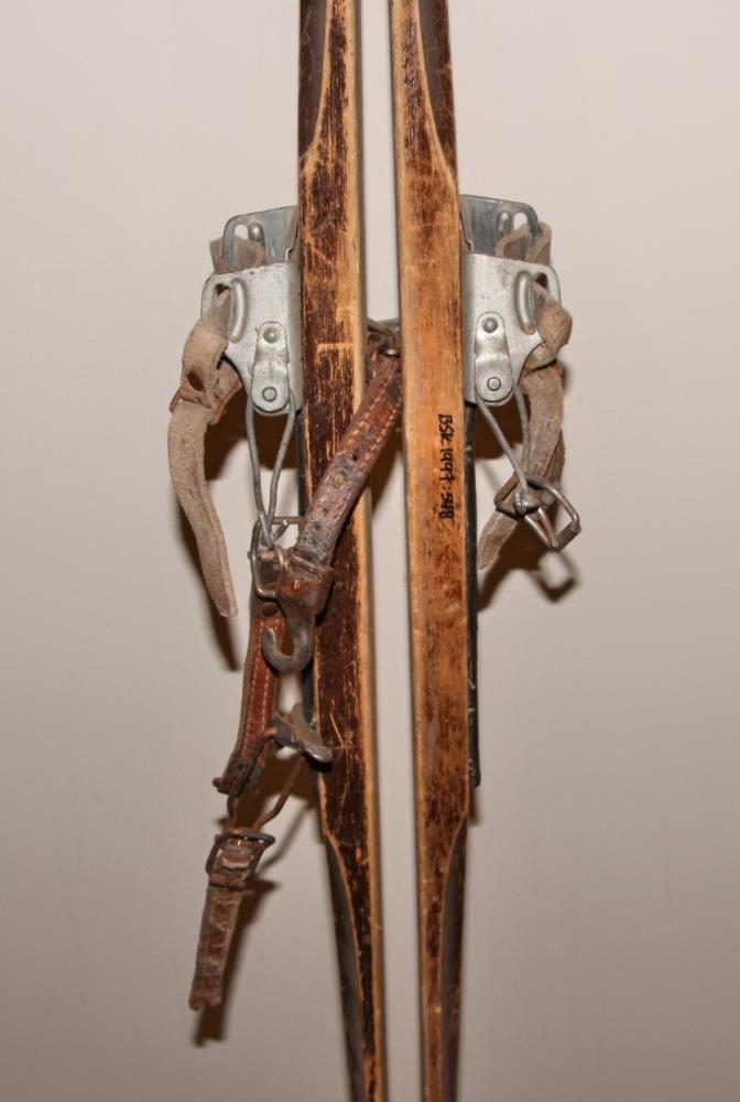 Skíði úr furu/greni, 186 cm löng, ekki gömul. Brúnmáluð að ofanverðu. Svartar rifflaðar gúmmímottur í fótinn. Álfestingar með leðurólum.