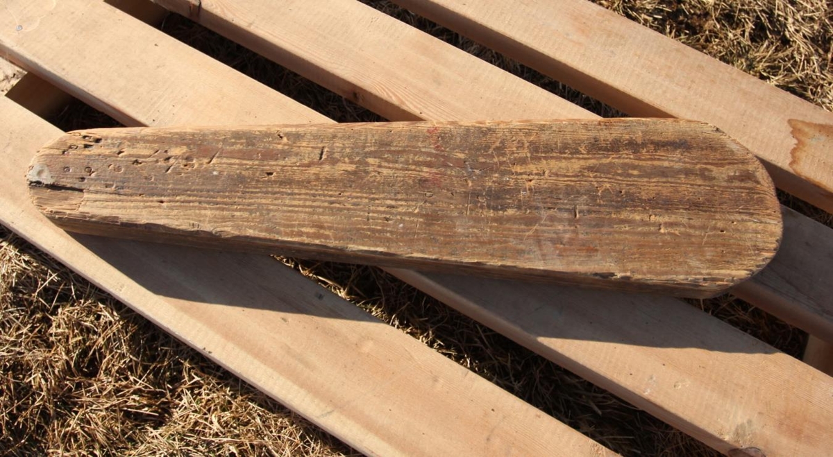 Ermatré úr furu. Lengd 62,5 cm, breidd mest 15,5 cm, minnst 8,5 cm. Þykkt 3,8 cm. Notuð til að pressa jakkaermar.