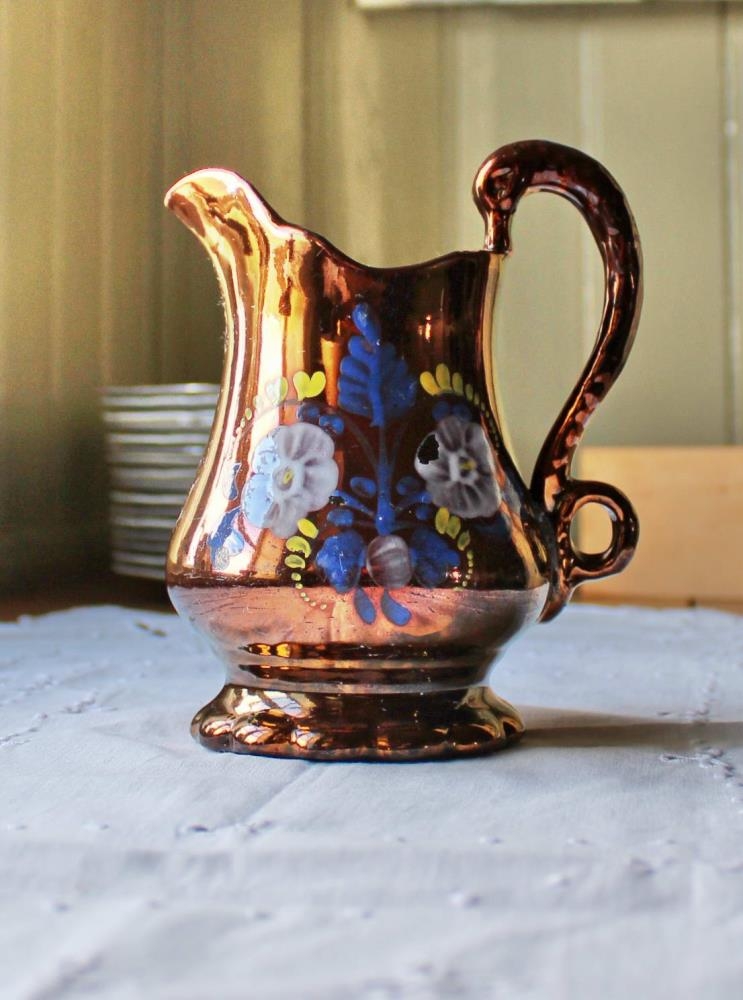Mjólkurkanna úr brúnum leir, glerjuð með eins konar málm- eða koparlituðum gljáa, dökkbrúnum að utan og að innan vel niður fyrir stút. Annars hvít að innan. Hæð 15,3 cm, þvermál 8,2 cm. Sitt hvoru megin er blómamynstur, tvö blóm, með bláum greinum og blöðum og gulu skrauti, svolítið kvarnað úr munstrinu.