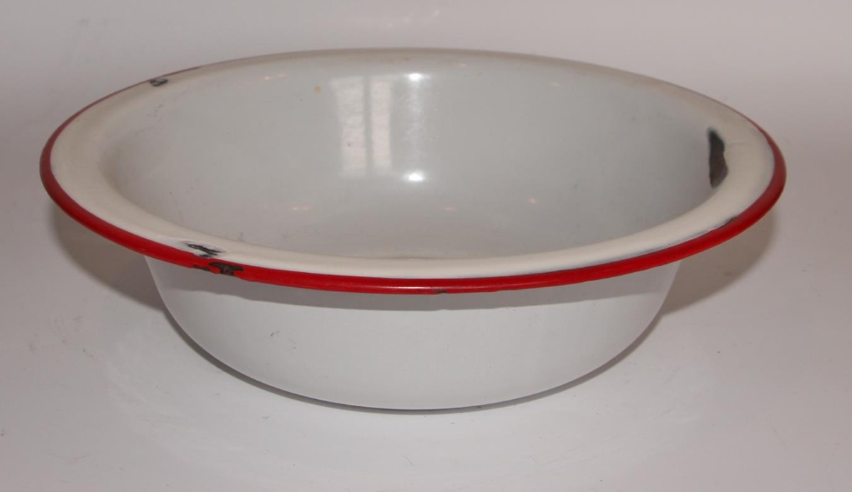Vaskafat, emaljerað hvítt, skellótt með rauðri barmrönd. Þvm. á barma 32 cm. Gat er á einum stað. Notað við hár- og handþvotta auk minni háttar fataþvotta.