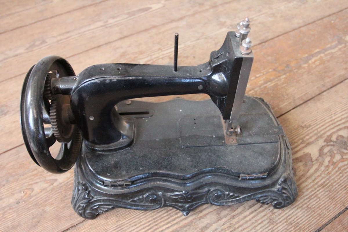 Saumavél úr járni, máluð svört. Frekar lítil. Saumavélin stendur á járnplani á fótum og er hægt að opna hana og komast að henni neðan frá. Á gylltum sporöskjulaga platta hægra megin á vélinni (við handfangið) stendur CLEMENS MULLER DRESDEN.