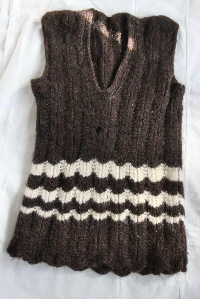 Vesti úr ull. Hvítt og svart á litinn. Bekkurinn í vestinu er hvítur og það eru þrír misbreiðir bekkir í vestinu.