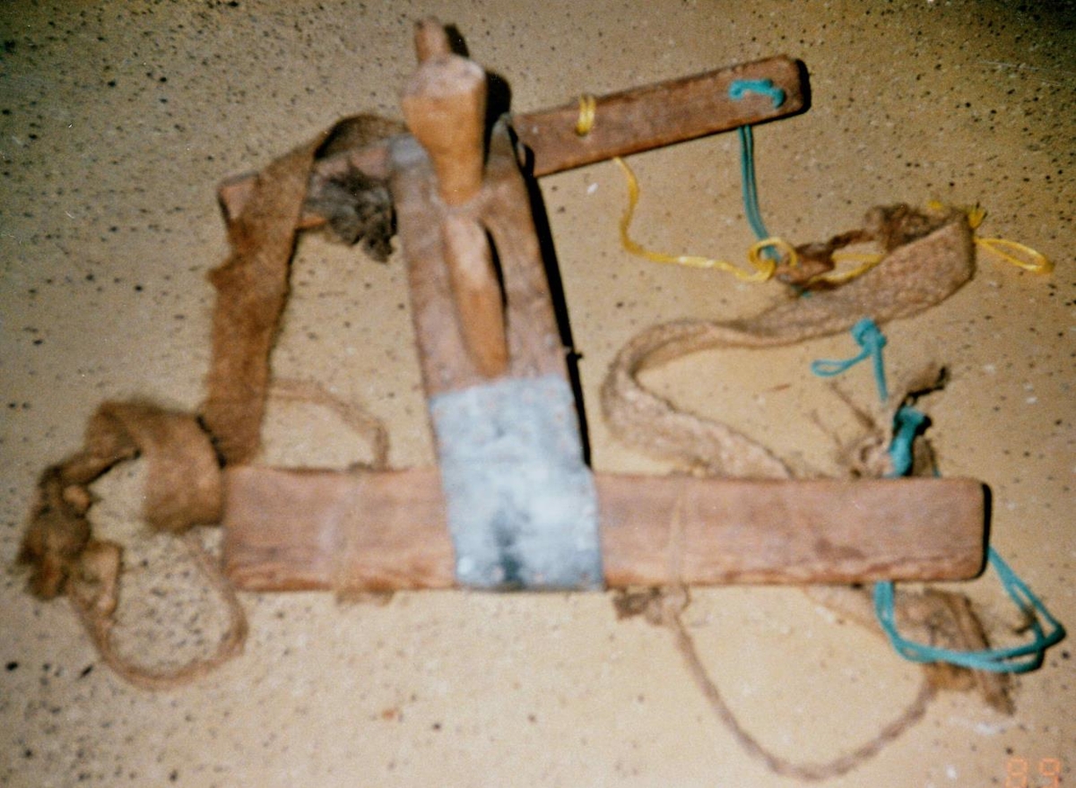 Klyfberi úr tré með járnþynnum á báðum hliðum til styrktar. Klakkarnir eru þrír, misstórir.