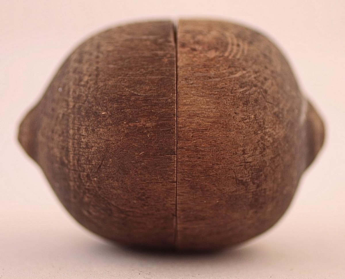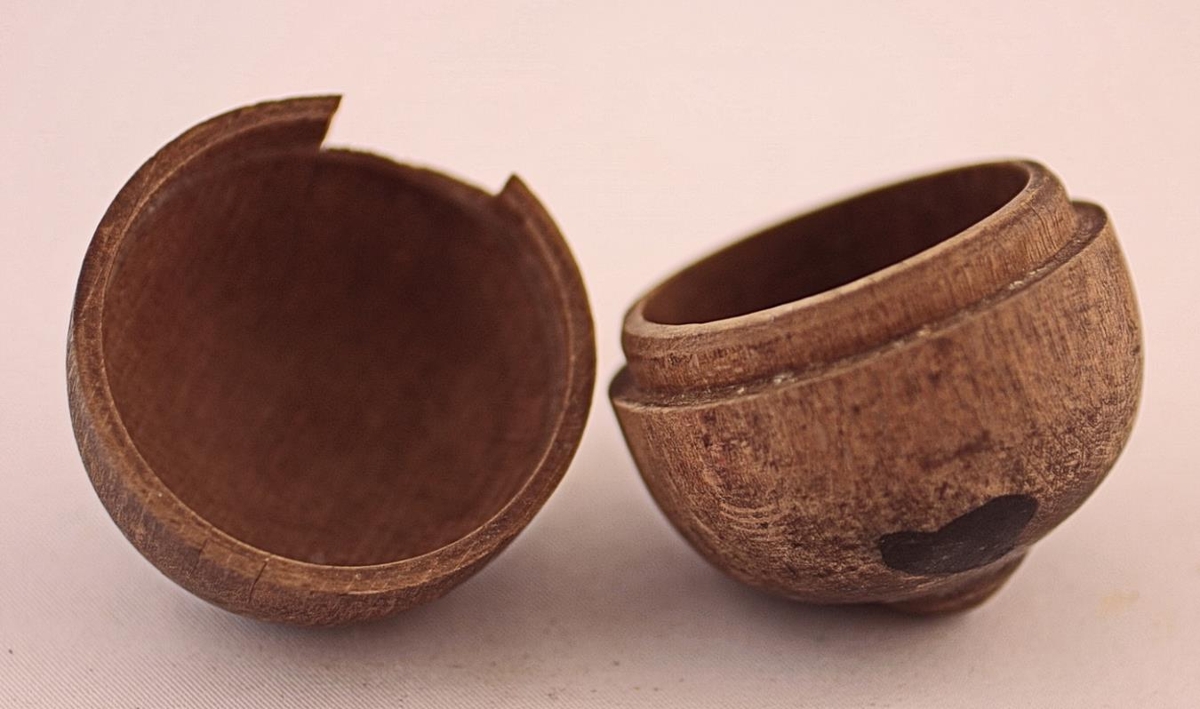 Lítill renndur baukur úr brenni. Hann er í tvennu lagi og eru helmingarnir að heita má eins, nema á öðrum hlutanum, sem kalla mætti botnhluta, er bryggja, sem lokhlutinn fellur yfir. Á endunum eru litlir toppar. Baukurinn er 4,7 cm í þvermál og um 6 cm á milli endanna. Örlítið er flaskað úr honum. Óvíst er til hverra nota hann hefur verið ætlaður.