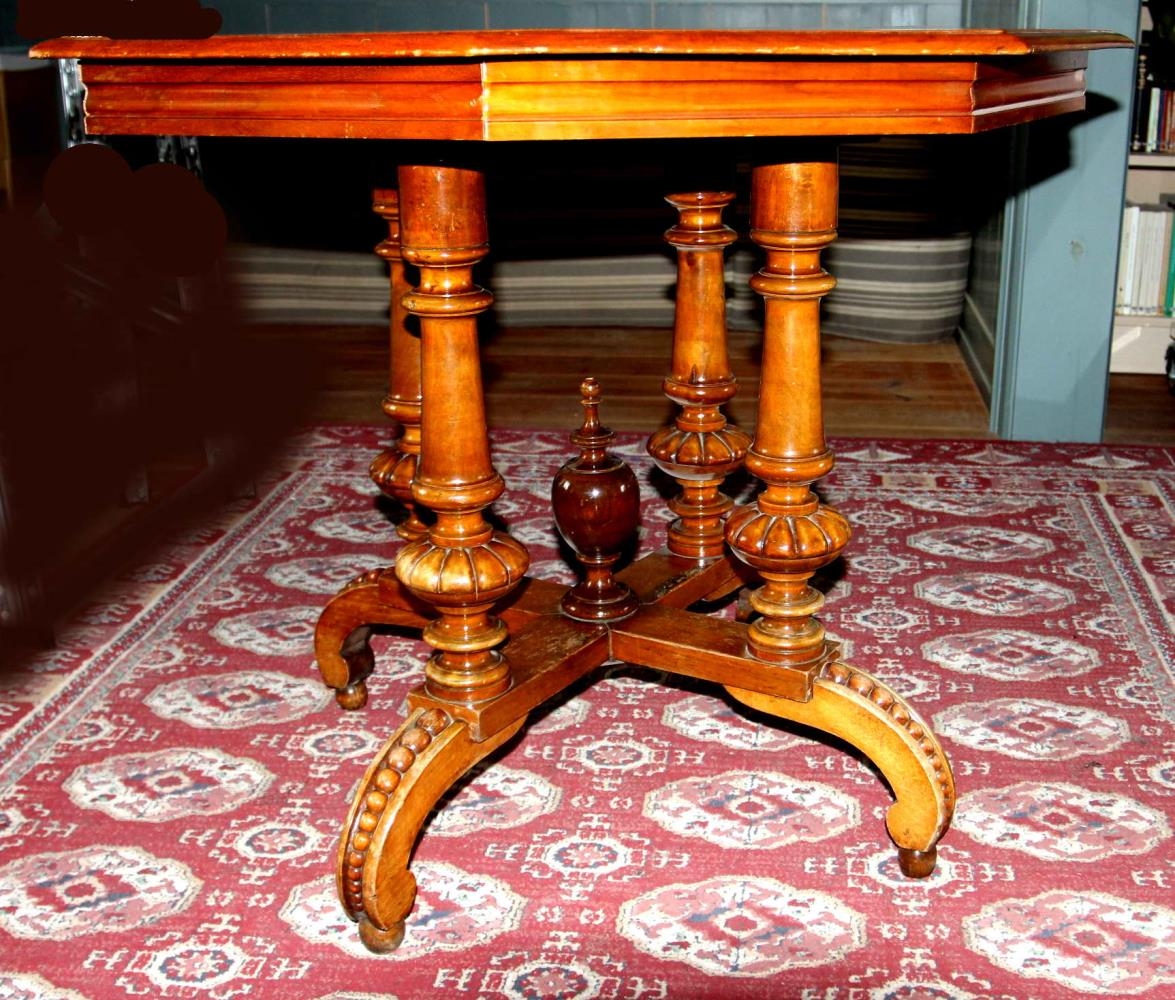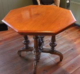 Borð - borðstofuborð úr furu, lakkað. Hæð alls 74 cm. Borðplatan er átthyrnd, 90 cm breið, bilið er 37,5 cm.