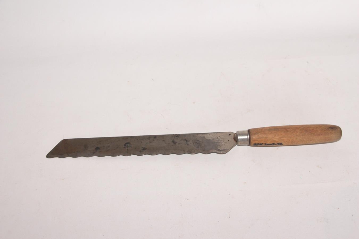 Brauðhnífur úr járni, með tréhaldi. Lengd 32,2 cm. Úr þunnu járnblaði með „bylgjaða“ egg. Töluvert notaður.