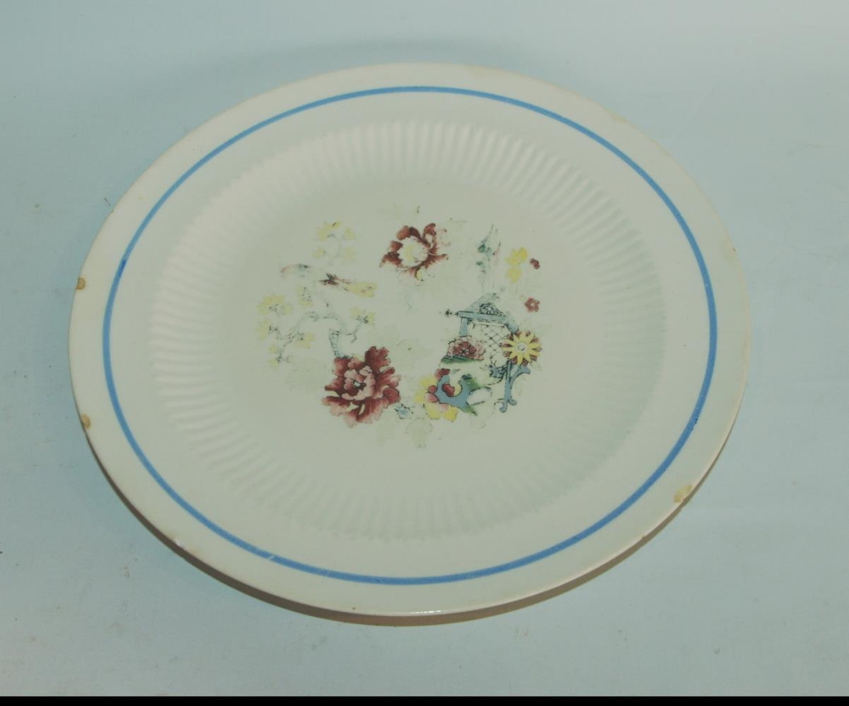Hvítir diskur, grunnur glerjaður úr keramik. Stærð 25,4 cm. Máður og gamall. Diskurinn er ekkert merkilegur nema að hann er mikið notaður og dæmigerður fyrir 20. öldina. Í sporöskjulaga grænum stimpil neðan á disknum stendur: NASCO og að því er virðist USA og undir er: INDIA. Ofan á er blá rönd á miðjum börmum, bárótt skil barms og miðflatar sem á er blómamynstur og grein sem á situr stéllangur fugl, við handriði og í fjarska fjöll. Litir: blátt, gult og brúnt.