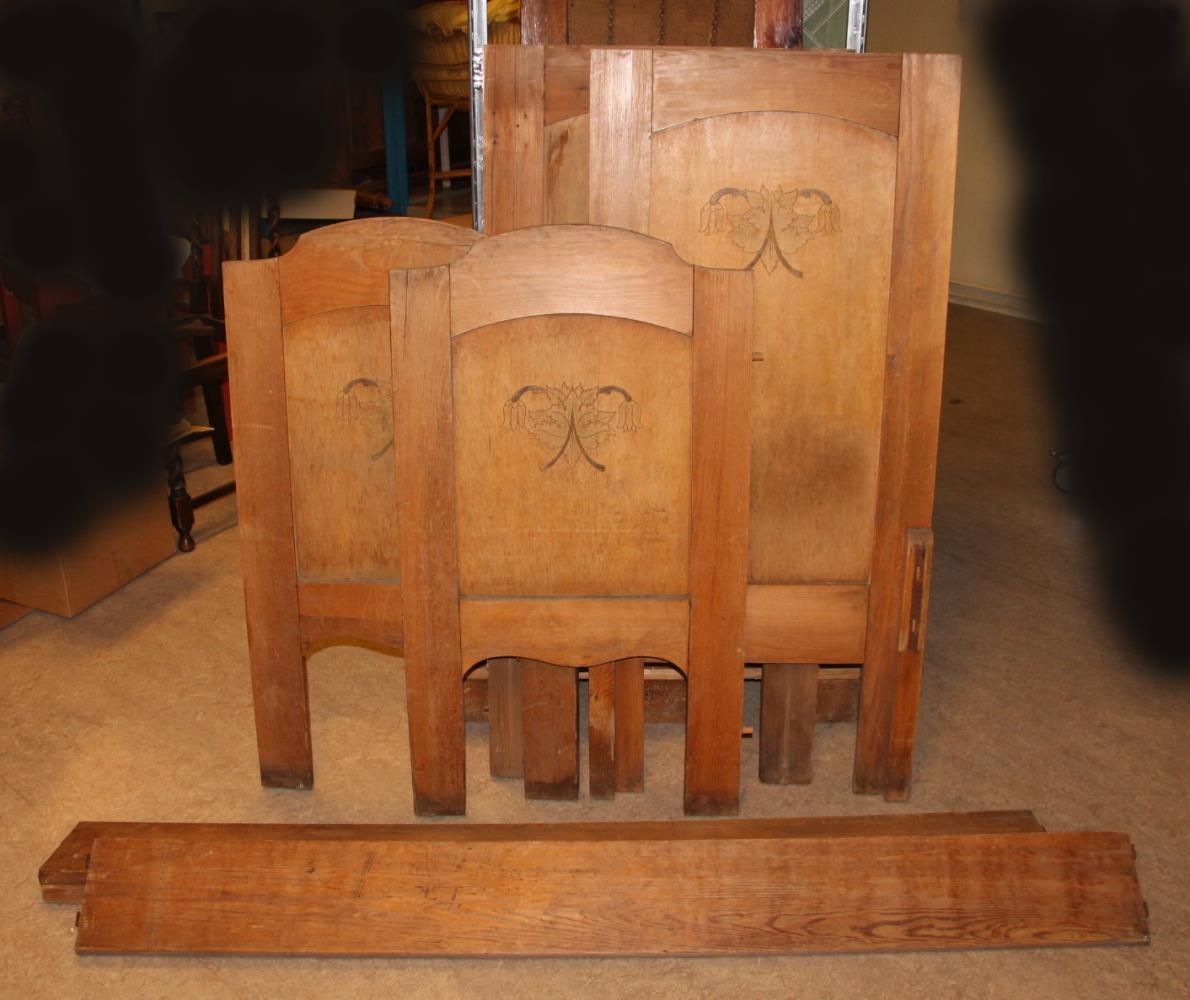 Hjónarúm, annað af tveimur. Hinu er búið að henda. Rúmið er smíðað um 1940 úr harðvið, ljóst að lit. Höfuðgaflinn er 125,5 cm á hæð með fótum, breidd er 114 cm. en gaflinn er í tveimur hlutum, jafnbreiðum. Höfuðgaflinn er heill og á framhlið er útskorið laufmynstur og tvö hangandi blóm, innanvert á gaflinum. Gaflinn er ferkantaður.