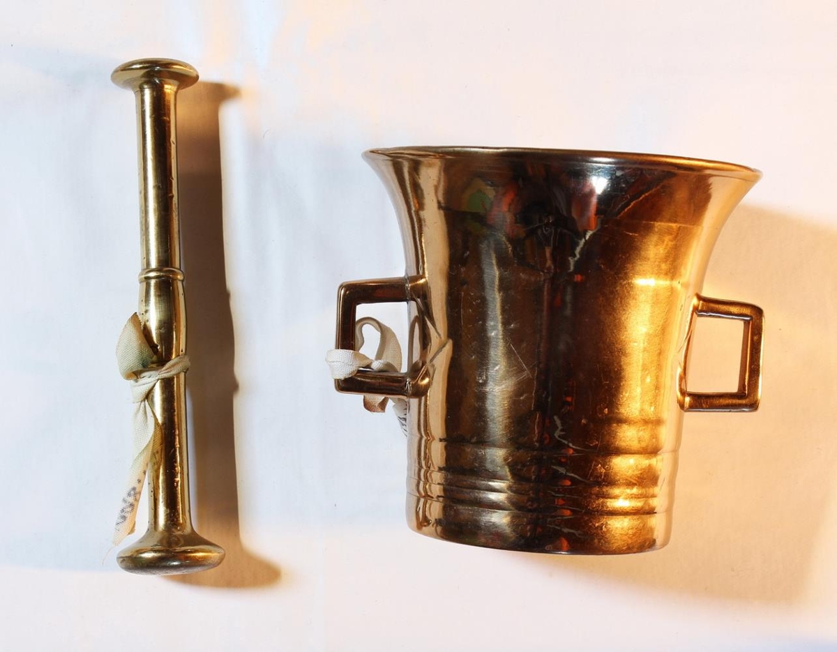 Mortél úr kopar með koparstauk. Mjög þungt og efnismikið. Þvermál 12 cm og hæð 11,5 cm með 2 höldum, ferköntuðum 3,5 x 2,3 cm. Staukurinn er 16,6 cm langur. Mjög fallegur gripur. Notað til að steyta kryddjurtir.