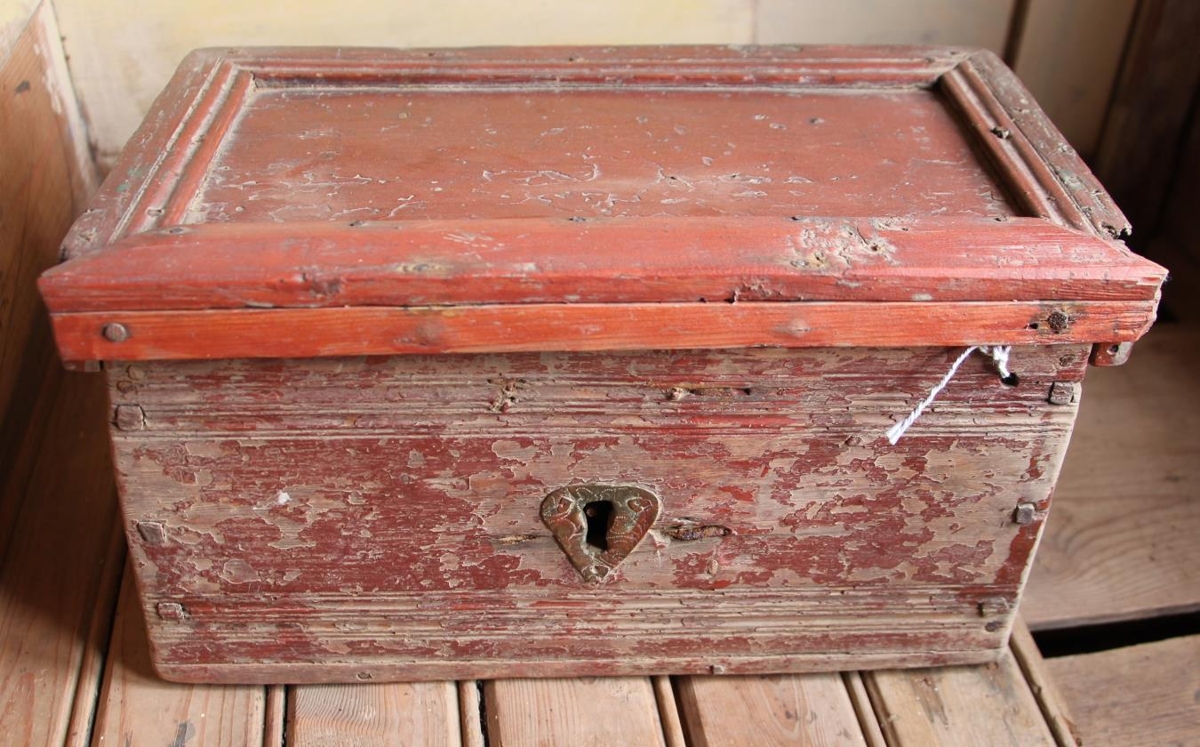 Kistill úr furu, trénegldur. Hann er um 18,2 x 30 cm og 16-16,5 cm að hæð. Hliðar eru strikheflaðar og strikheflaður listi á loki umhverfis, en listinn að framan er nýsettur og með öðru sniði. Lokið nær út fyrir kassann á alla vegu. Lamir eru úr látúnsþynnum, svo og skráarlaufið sem er því sem næst hjartalaga. Skráin virðist íslensk en lykil og læsingarjárn vantar. Handraði, er hefur verið til vinstri handar, er nú týndur nema botnfjölin. Heldur er kistillinn allur óvönduð smíði. Hann er rauðmálaður.