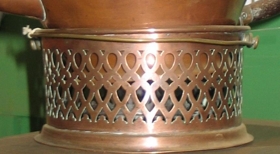 Glóðaker úr eir með látúnshöldu. Kerið er sporöskjulaga, botninn 14,3 x 15,3 cm og flatur og hliðarnar 7,8 cm háar og brasaðir saman annars vegar með kopar. Kerið er nokkru minna um sig en botninn og með brún efst. Hliðarnar eru gagnskornar allt umhverfis, og líkist mynstrið eggjum, tíglum, skjöldum o.fl., en er þó einfalt að gerð.