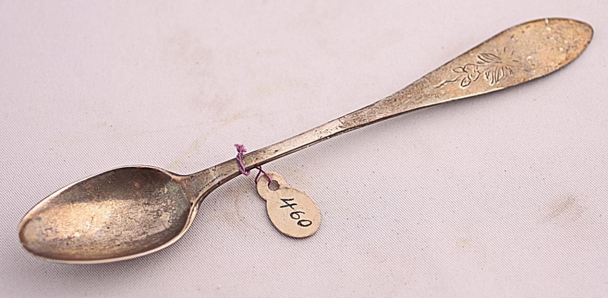 Teskeið úr silfri. Hún er 14,1 cm löng og blaðið 2,3 cm breitt og um 4 cm langt. Skaftið er mjóast því nær neðst en breikkar aftur og þynnist en mjókkar síðan að endanum. Punktaröð hefur verið með jöðrum og á skaftið grafin blómplanta, en gröfturinn orðinn ógreinilegur af sliti. Stimpill smiðsins er neðan á skaftinu, tvísettur, en nú ólæsilegur (H og skraut í kring), en aftan við nafnstimpilinn er stimplað ártalið 1809. Sennilega erlend.