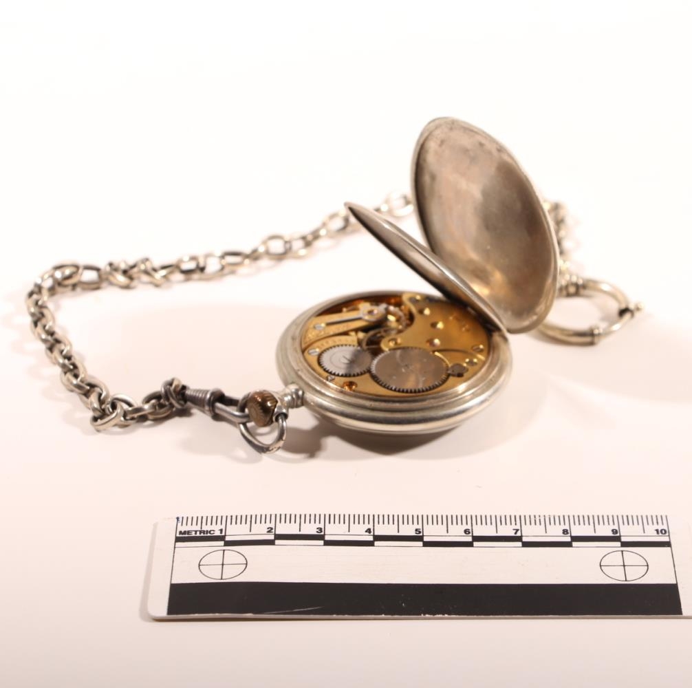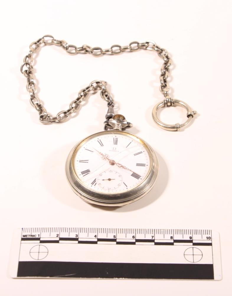 Vasaúr úr silfri. Þvermál 5,3 cm. Lengd á keðju u.þ.b. 34 cm. Þvermál á hring í enda keðjunnar er 2,5 cm. Lengd á úri með trekkjara 6,4 cm. Keðjan er úr járni. Hvít plastskífan er með rómverskum tölum fyrir stundirnar en tölustöfum fyrir sekúndur. Aftan á úrinu er lok, skjöldur, þegar hann er opnaður sést grafið í bakið á úrinu OMEGA GRANO PRIX PARÍS 1900. Glerið á úrinu er sprungið þvert. Mjög fallegt og nokkuð vel með farið úr. Úrið er geymt í kassanum sem það kom í.