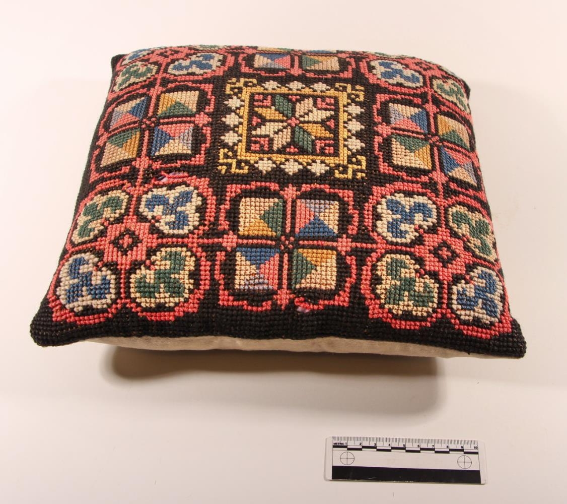 Púði, heimatilbúinn. Stærðir 35 x 33 cm. Krosssaumur í jafa. Eins og púði nr. 1998:165. Litir: svart, bleikt, hvítt, ljósbrúnt, karrígult, ljósblátt, dökkblátt og grænt. Fallegt mynstur. Aðeins farinn að slitna á tveim stöðum (göt) en annars staðar vel með farinn. Í bakið er slétt, grátt flauel.